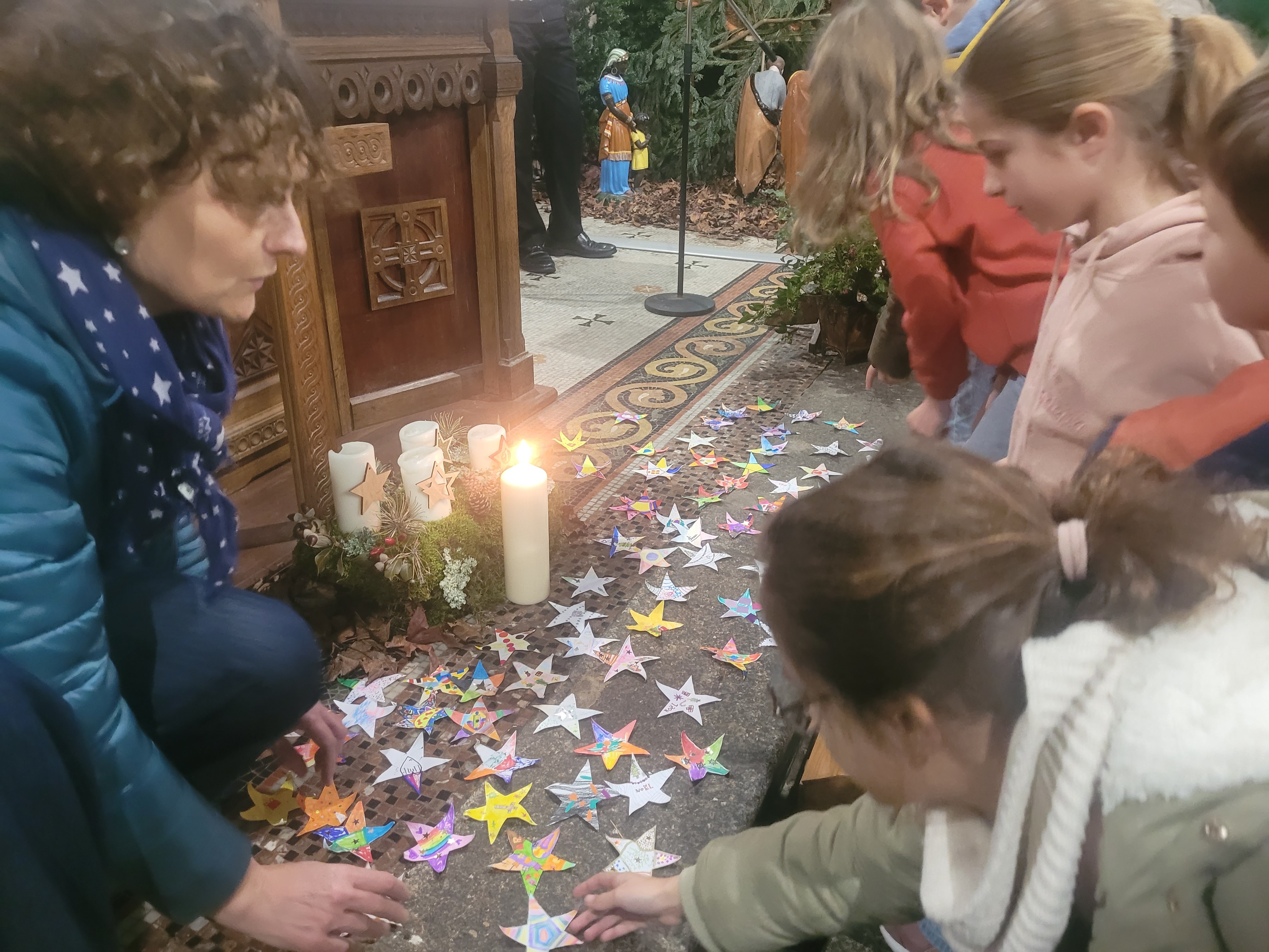 Cette année, nous avions fait le choix de célébrer la promesse de Dieu faite aux hommes d’envoyer son fils Jésus, comme un cadeau. Le père Verkys et les catéchistes ont partagé ce moment avec les écoliers afin de préparer nos cœurs pour Noël. Pour symboliser ce moment d’espérance, nous avons déposé des étoiles décorées près de la crèche. Une démarche simple pour signifier que, comme Marie, nous sommes entrés dans la période d’attente de l’arrivée de la Bonne Nouvelle.