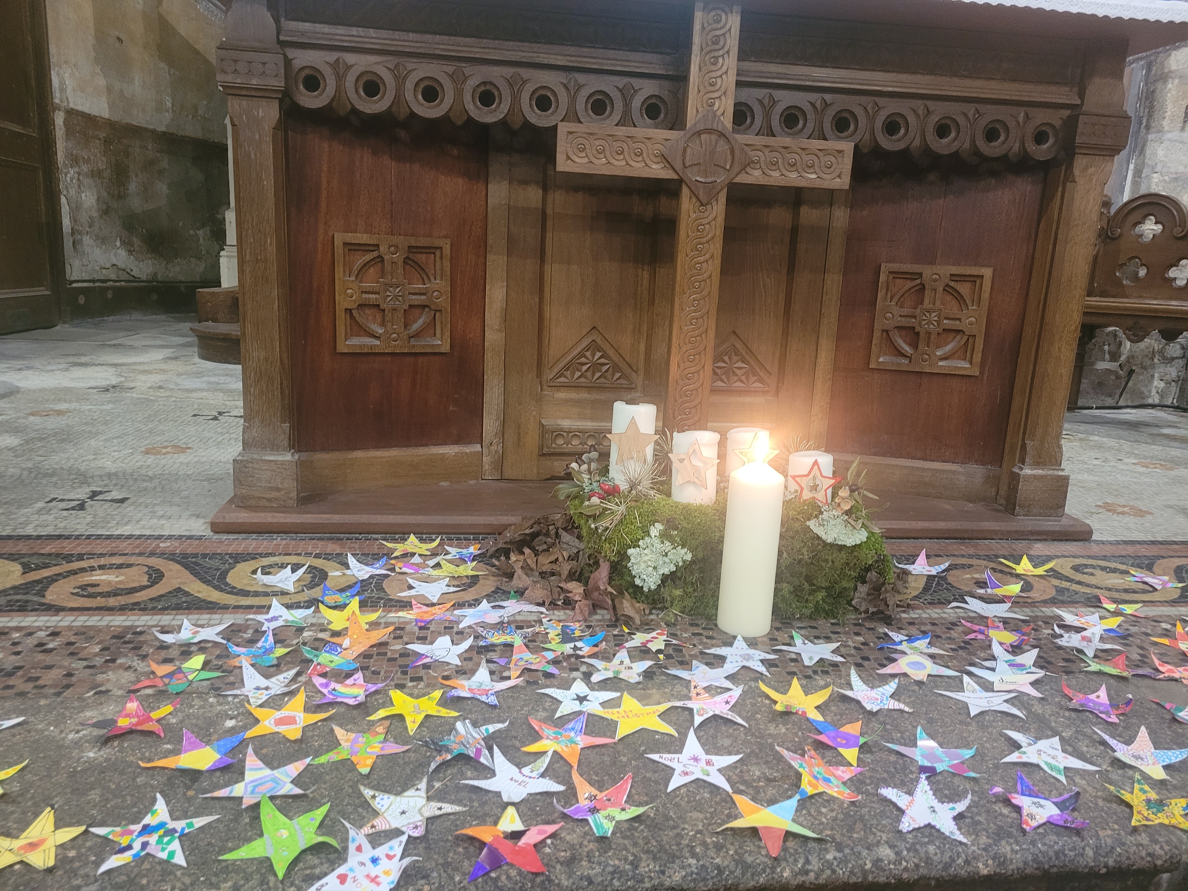 Cette année, nous avions fait le choix de célébrer la promesse de Dieu faite aux hommes d’envoyer son fils Jésus, comme un cadeau. Le père Verkys et les catéchistes ont partagé ce moment avec les écoliers afin de préparer nos cœurs pour Noël. Pour symboliser ce moment d’espérance, nous avons déposé des étoiles décorées près de la crèche. Une démarche simple pour signifier que, comme Marie, nous sommes entrés dans la période d’attente de l’arrivée de la Bonne Nouvelle.