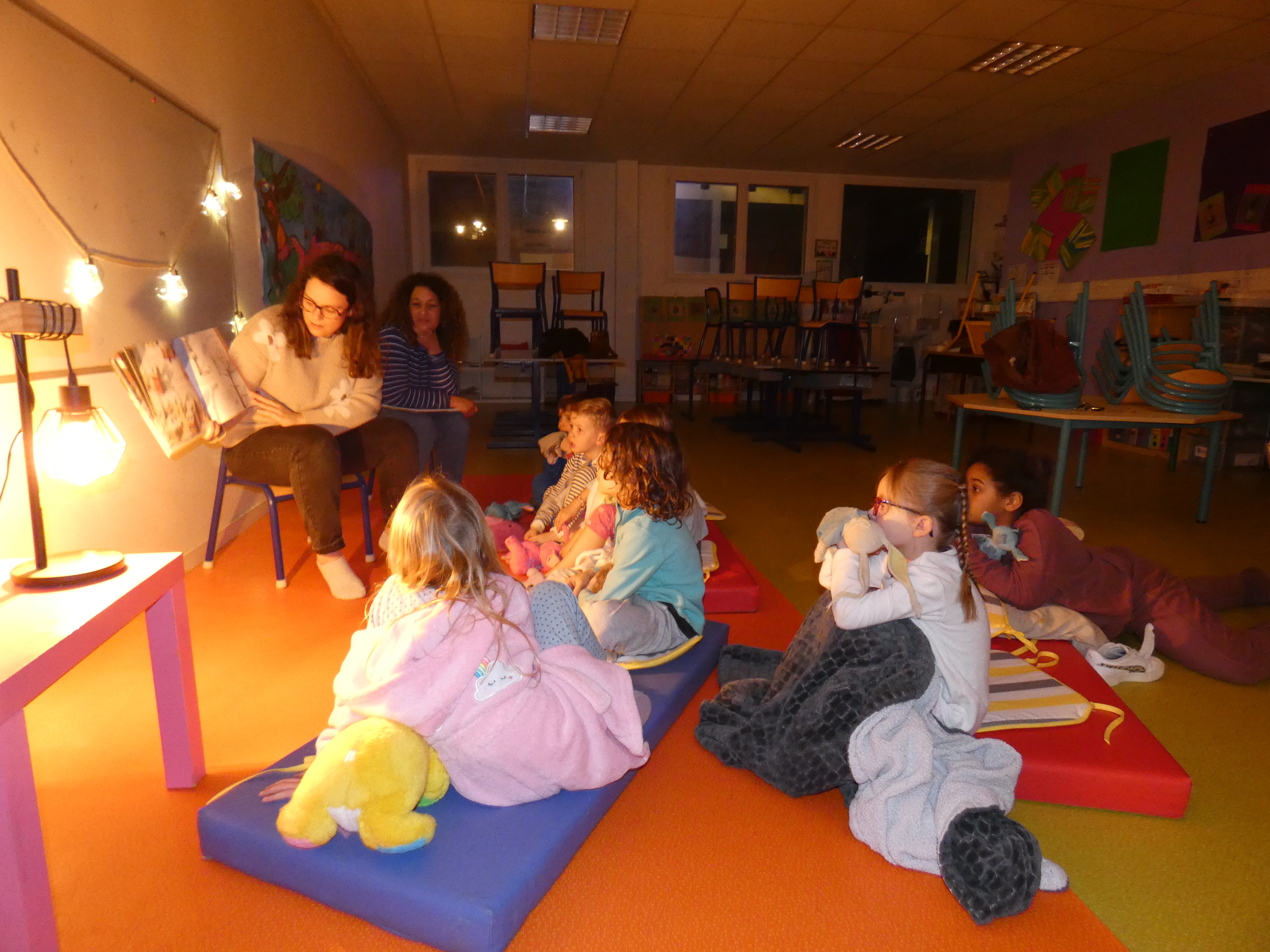 Les enfants étaient ravis de se retrouver autour d’un livre mais c’était surtout l’occasion de découvrir les classes dans la pénombre, de voir les enseignants en pyjama et surtout, de partager un bon avec les copains.