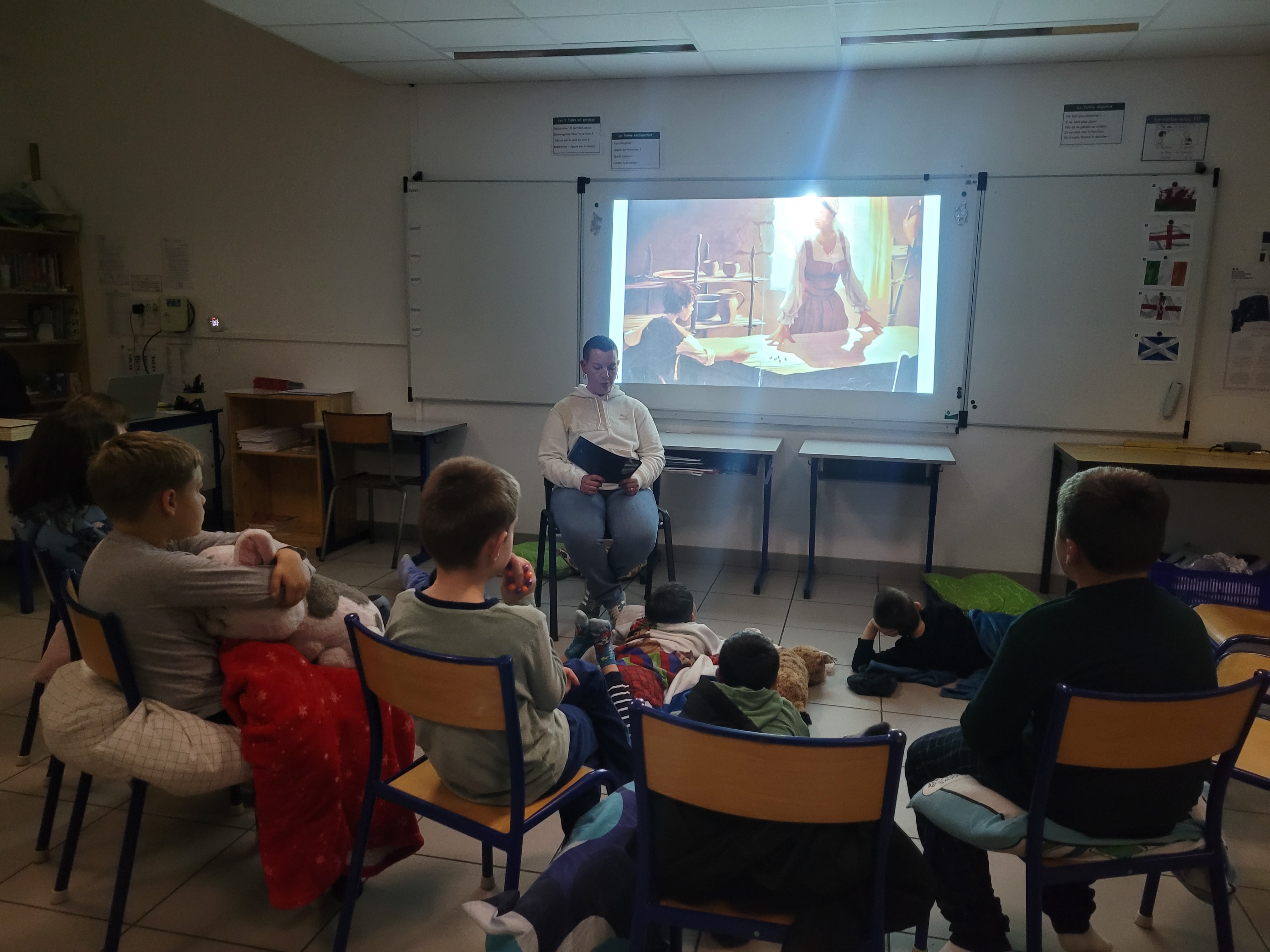 Les enfants étaient ravis de se retrouver autour d’un livre mais c’était surtout l’occasion de découvrir les classes dans la pénombre, de voir les enseignants en pyjama et surtout, de partager un bon avec les copains.