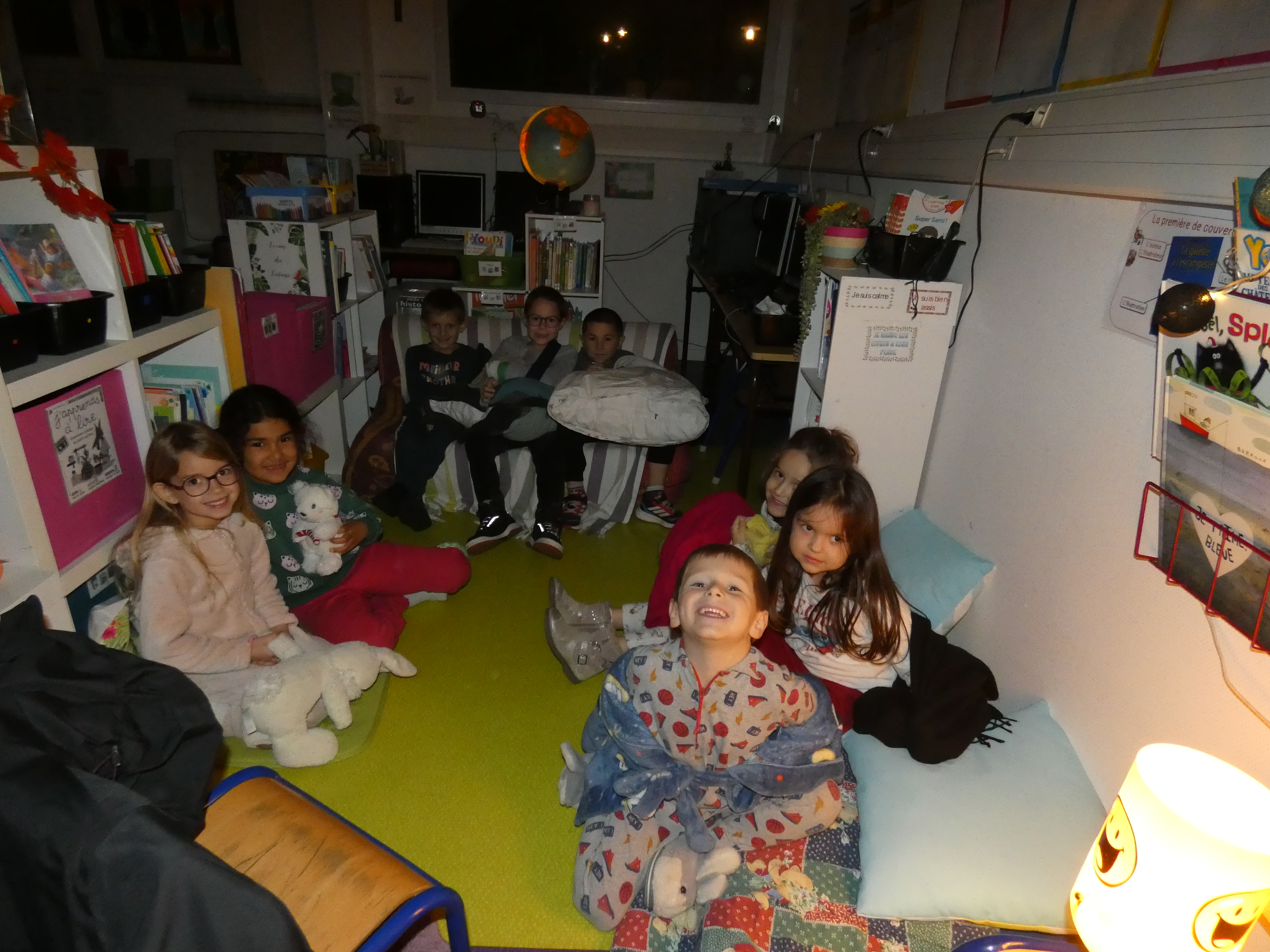 Les enfants étaient ravis de se retrouver autour d’un livre mais c’était surtout l’occasion de découvrir les classes dans la pénombre, de voir les enseignants en pyjama et surtout, de partager un bon avec les copains.